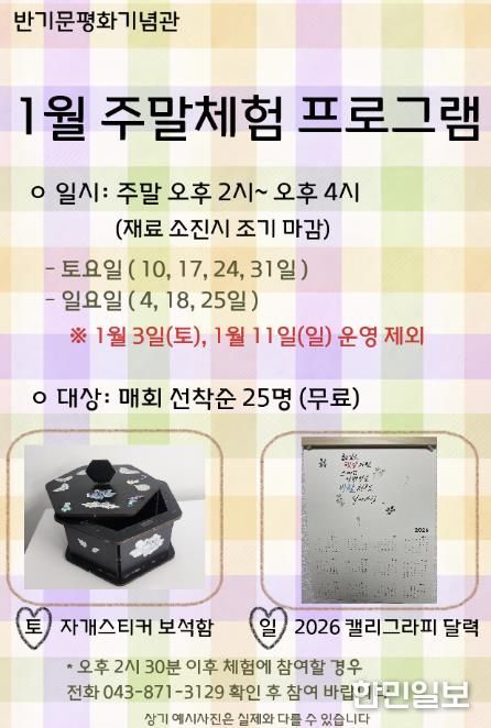 한민일보 서울포커스 김다남 기자 | 음성군 제8대 유엔사무총장 반기문 평화기념관에서는 관람객을 위해 2026년 1월 주말 무료 체험 프로그램을 운영한다.