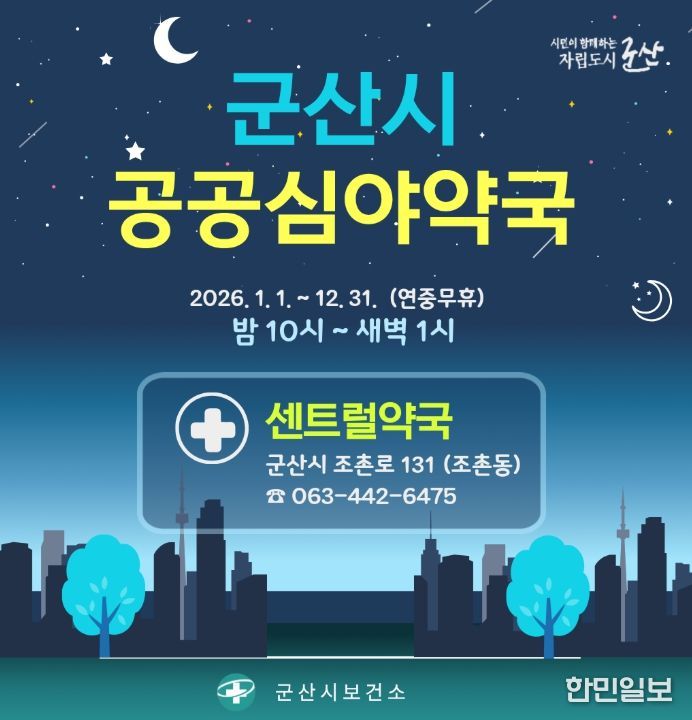 한민일보 서울포커스 김용택 기자 | 군산시가 시민들의 심야시간대 의약품 접근성을 높이기 위해 2026년에도 공공심야약국을 ‘센트럴약국’에서 지속 운영한다고 29일 밝혔다.