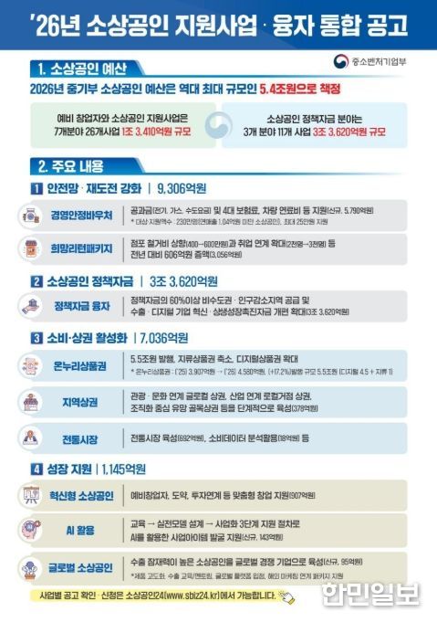 한민일보 서울포커스 임철현 기자 | 중소벤처기업부는 29일 2026년 소상공인 지원사업·융자 통합 공고를 조기에 시행하여 소상공인의 경영회복과 지속 성장을 뒷받침하기 위해 총 7개 분야의 다양한 정책 사업을 추진한다고 밝혔다.