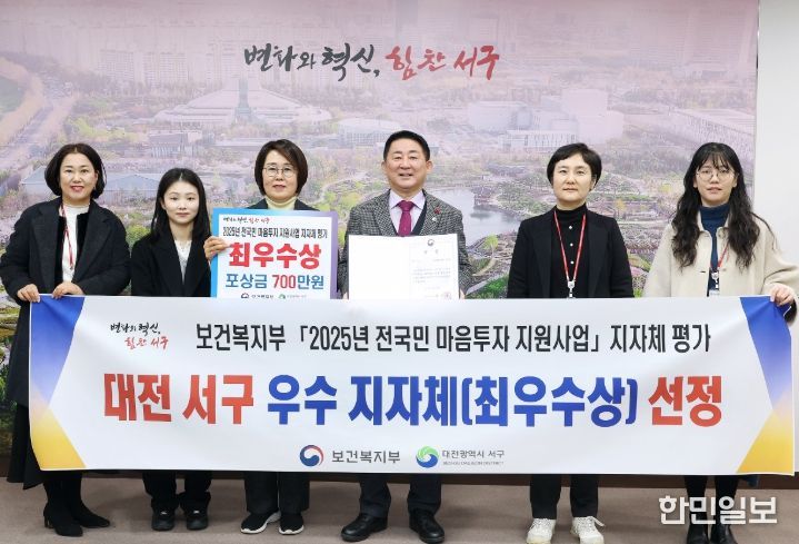 한민일보 서울포커스 임경복 기자 | 대전 서구는 보건복지부 주관 ‘전국민 마음투자 지원사업 지자체 평가’에서 최우수 지자체로 선정돼, 표창과 함께 포상금 700만 원을 받았다고 29일 전했다.