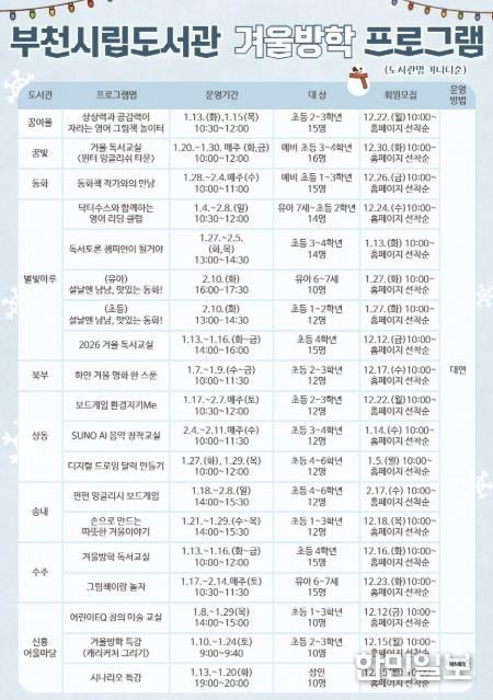 한민일보 서울포커스 김윤이 기자 | 부천시는 겨울방학을 맞아 내년 1월부터 2월까지 부천시립도서관에서 전 연령을 대상으로 독서문화 프로그램과 행사를 운영한다고 30일 밝혔다. 이번 프로그램은 연령과 관심사에 따라 다양한 참여 기회를 제공하기 위해 마련됐다.
