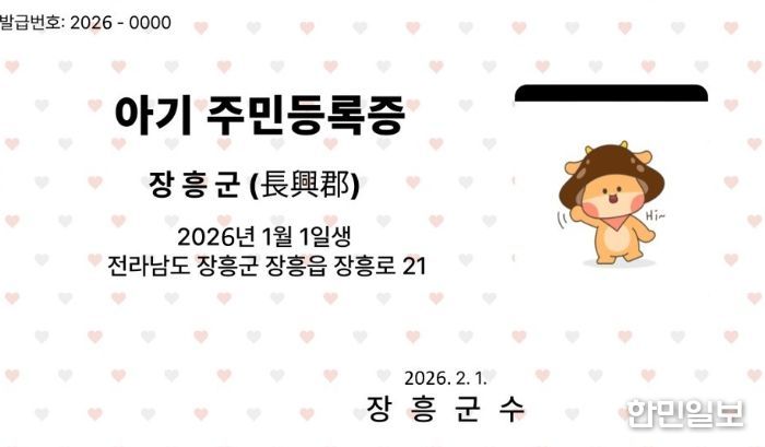 장흥군 관계자는 “아기 주민등록증을 통해 아이의 출생을 기념하며, 가족들에게 따뜻한 추억이 되길 바란다”며 “앞으로도 다양한 출산 장려 정책을 마련해 아이 키우기 좋은 장흥을 만들겠다”고 밝혔다.