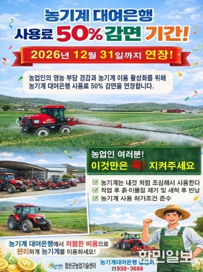 한민일보 서울포커스 김은금 기자 | 합천군은 농업인의 경영 부담을 완화하고 안정적인 영농 활동을 지원하기 위해 농기계대여은행 농기계 사용료 50% 감면 기간을 2026년 12월 31일까지 연장한다고 밝혔다.