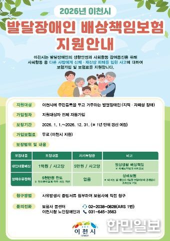 한민일보 서울포커스 박용남 기자 | 이천시는 2026년 1월 1일부터 경기도 최초로 발달장애인을 위한 배상책임보험 가입 지원을 시행한다고 밝혔다.