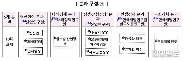 오늘 회의에서는 경인사연 소속 연구기관들이 집중 연구할 경제 대도약 10대 과제를 선별해 5개 분과로 편성하고 분과별 주관 연구기관(PM)을 지정했다. 아울러 연구 성과가 실제 정책으로 이어질 수 있도록 기재부를 중심으로 관계부처가 분과별 논의에 적극 참여해 연구기관들과 의견을 교환하도록 할 계획이다.