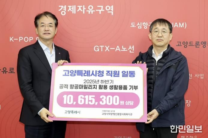 한민일보 서울포커스 김은금 기자 | 고양특례시는 연말을 맞아 지난 30일 이동환 고양시장과 김진우 고양시덕양행신종합사회복지관장이 참석한 가운데 열린시장실에서 ‘2025년 하반기 공적 항공마일리지 활용 기부물품 전달식’을 가졌다고 밝혔다.