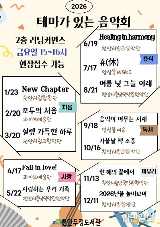 한민일보 서울포커스 황준형 기자 | 천안시 두정도서관은 내년부터 ‘테마가 있는 음악회’를 운영한다고 31일 밝혔다.