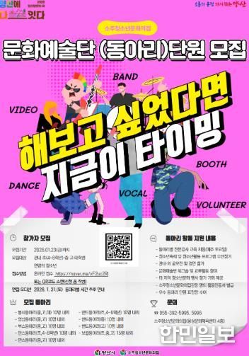 한민일보 서울포커스 김은금 기자 | 양산시 소주청소년문화의집은 청소년의 문화예술 역량 강화와 자율적인 동아리 활동 지원을 위해 '2026 소주청소년문화의집 청소년문화예술단' 단원을 모집한다.