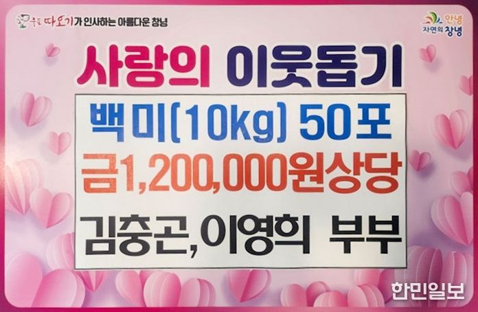 성낙인 창녕군수는 “해마다 잊지 않고 어려운 이웃을 위한 나눔을 실천해 주시는 김충곤·이영희 부부께 깊이 감사드린다”며 “이러한 따뜻한 마음이 지역사회 전반으로 확산되길 바란다”고 말했다.