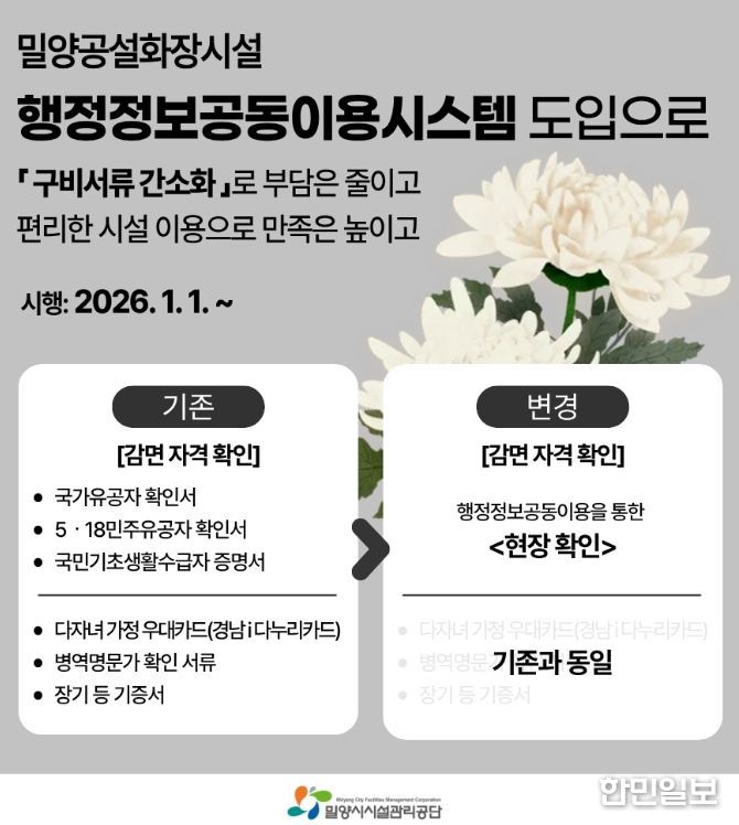 한민일보 서울포커스 김은금 기자 | 밀양시시설관리공단은 밀양공설화장시설을 이용하는 유가족의 편의를 높이기 위해 구비서류를 간소화하는 ‘행정정보 공동이용 시스템’을 오는 1월 1일부터 시행한다.