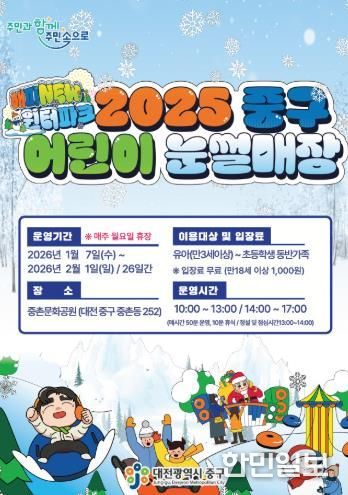 한민일보 서울포커스 임경복 기자 | 대전 중구는 오는 1월 7일부터 2월 1일까지 약 한 달간 중촌문화공원 내 어린이 눈썰매장을 운영한다고 밝혔다.