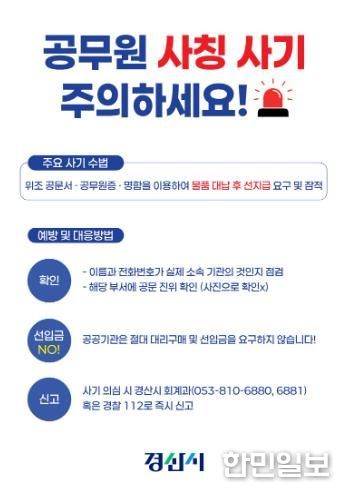한민일보 서울포커스 임경복 기자 | 경산시는 최근 지역 소상공인들을 상대로 공무원 사칭 사기가 기승을 부리고 있는 가운데 ‘공무원 사칭 사기 예방 대응반’을 편성해 운영한다고 밝혔다.