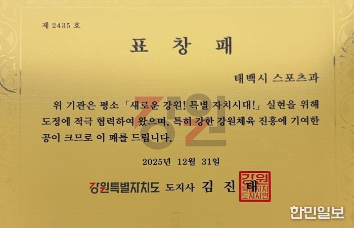 한민일보 서울포커스 임경복 기자 | 태백시는 태백시청 스포츠과가 지난 12월 31일, 체육 발전과 지역경제 활성화에 기여한 공로를 인정받아 강원특별도지사 기관표창을 수상했다고 밝혔다.