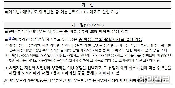 이에 따라 분쟁조정 시 주방 특선(오마카세), 고급 식사(파인다이닝) 등 예약 기반 음식점과 대량 주문(또는 단체 예약)의 경우 총 이용금액의 40% 이하, 일반 음식점은 20% 이하를 기준으로 위약금을 설정할 수 있다.
