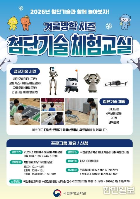 한민일보 서울포커스 기자 | 과학기술정보통신부 국립중앙과학관은 겨울방학을 맞이하여 2026년 1월 중 매주 토요일 4일(10일, 17일, 24일, 31일) 동안'겨울방학 시즌 첨단기술 체험교실'을 국립중앙과학관 미래기술관 3층에서 운영한다고 밝혔다.