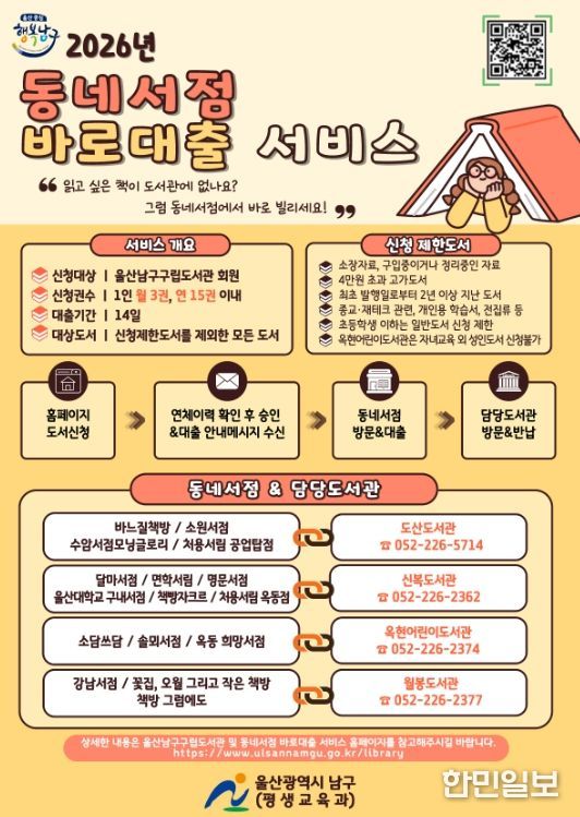 한민일보 서울포커스 기자 | 울산 남구는 2026년'동네서점 바로대출'서비스를 1월 2일부터 운영한다고 밝혔다.