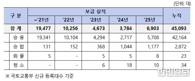 지난해(2025년) 수소차는 전년(2024년)에 비해 182% 늘어난 6,903대가 보급됐다. 특히 수소 승용차는 7년 만에 신차가 출시됨에 따라 전년도 대비 210%가 증가한 5,708대를 기록했다.