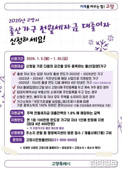한민일보 서울포커스 김은금 기자 | 고양특례시는 무주택 출산가구의 주거비 부담을 덜어주기 위해 ‘2026년 고양시 출산가구 전월세자금 대출이자 지원 사업’ 신청을 1월 30일까지 받는다고 밝혔다.
