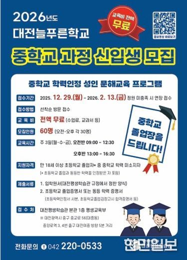 한민일보 서울포커스 유한희 기자 | 대전평생학습관은 2026년 2월 13일까지 2026년 대전늘푸른학교 중학교 학력인정 과정 신입생을 모집한다고 밝혔다.