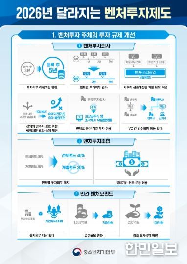 한민일보 서울포커스 임철현 기자 | 중소벤처기업부는 「벤처투자 촉진에 관한 법률」 및 하위법령(시행령, 시행규칙) 개정을 바탕으로 ’26년에 새롭게 달라지는 벤처투자 제도를 발표했다고 밝혔다.