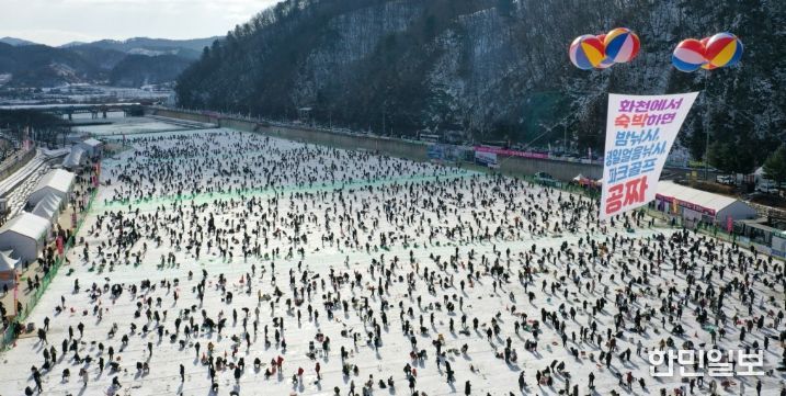 화천산천어축제에서는 거대한 얼음판 위에 동시에 수만명이 오르내리는 장면이 매일 반복된다.