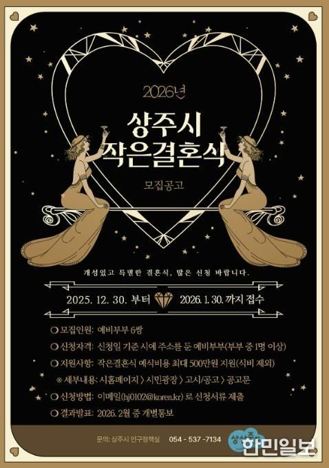 한민일보 서울포커스 김봉순 기자 | 상주시는 2026년 작은결혼식 예비부부 6쌍을 2025년 12월 30일부터 2026년 1월 30일까지 모집한다.