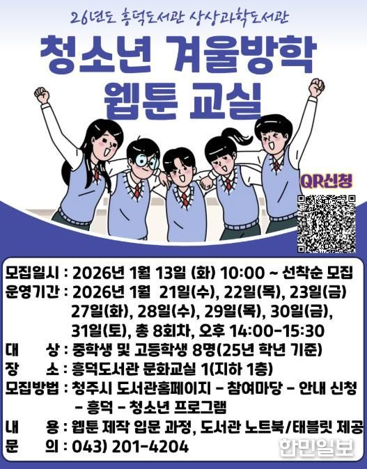 한민일보 서울포커스 김다남 기자 | 청주흥덕도서관은 겨울방학을 맞은 청소년들의 창의력과 표현력을 키우기 위한 ‘청소년 겨울방학 웹툰 공작소’ 참가자를 모집한다고 8일 밝혔다.