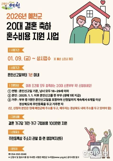 한민일보 서울포커스 임경복 기자 | 예천군은 20대 신혼부부들을 위한 ‘결혼 축하 혼수비용 지원사업’을 올해도 추진한다.