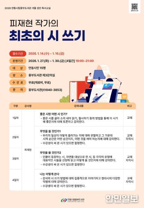안동시립도서관 관계자는 “이번 독서교실이 시 쓰기를 통해 일상을 새롭게 바라보고, 창작의 기쁨을 발견하는 특별한 계기가 되길 바란다”며 “시가 어렵게 느껴졌던 분들에게도 따뜻하고 즐거운 시간이 될 것”이라고 전했다.