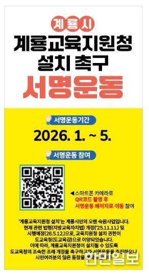 시 관계자는 “계룡시민 모두가 본 서명 운동에 적극적으로 참여할 수 있도록 다양한 홍보 채널을 통해 알릴 계획이며, 계룡시 교육의 새로운 도약을 위해 최선을 다하겠다”고 밝혔다.