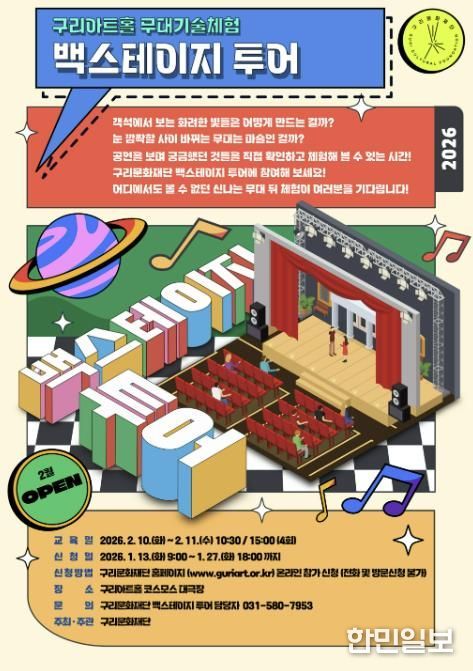 한민일보 서울포커스 김정옥 기자 | 구리문화재단은 〈무대 기술 체험 백스테이지 투어 프로그램〉 참가자를 오는 1월 13일 오전 9시부터 1월 27일 오후 6시까지 재단 홈페이지를 통해 선착순 모집한다고 밝혔다.