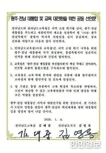 한민일보 서울포커스 임경복 기자 | 전라남도교육청과 전라남도가 광주·전남 대통합과 교육 대전환을 위한 공동선언문을 발표했다.