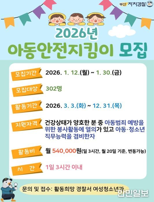 한민일보 서울포커스 임광현 기자 | 부산시 자치경찰위원회는 부산경찰청과 함께 오는 1월 12일부터 1월 30일까지 '2026년 아동안전지킴이'를 모집한다고 밝혔다.