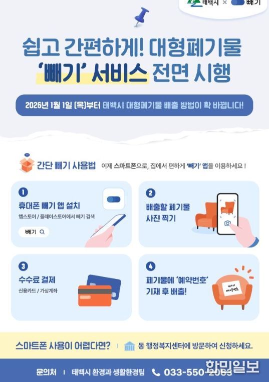 한민일보 서울포커스 임경복 기자 | 태백시는 2026년 1월 1일부터 대형폐기물 배출 신청부터 수수료 결제, 처리 결과 확인까지 전 과정을 스마트폰 앱 ‘빼기’를 통해 원스톱으로 처리할 수 있는 서비스를 본격 시행한다고 밝혔다.