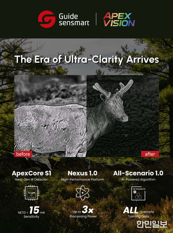 한민일보 서울포커스 김윤이 기자 | 라스베이거스 2026년 1월11일 -- 열화상 기술 분야의 글로벌 선도기업 가이드 센스마트(Guide Sensmart)(센트럴 홀, 21740번 부스)가 차세대 열화상 혁신 기술 ApexVision의 공식 출시와 함께 해당 기술이 적용된 신제품 라인업을 함께 공개했다. 가이드 센스마트는 이번 출시를 계기로 단순한 '열 탐지' 단계에서 '선명하고, 정밀하고, 지능적인 탐지' 단계로 이어지는 산업 전반의 도약과 더불어, 울트라 클라리티(Ultra-Clarity)로 정의되는 새로운 시대의 개막을 알렸다