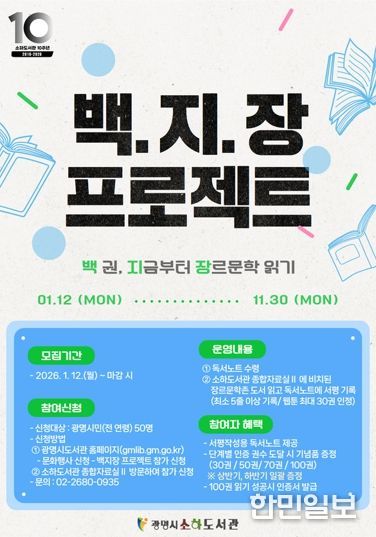 한민일보 서울포커스 임광현 기자 | 광명시 소하도서관은 오는 12일부터 장르문학 도서 100권 읽기 챌린지인 ‘백.지.장 프로젝트’ 참여자를 모집한다.
