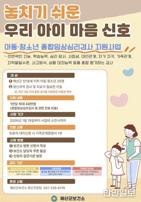 한민일보 서울포커스 임경복 기자 | 예산군보건소 정신건강복지센터는 2026년에도 아동·청소년기의 정신 건강 문제를 조기에 발견하고 건강한 성장 발달을 지원하기 위해 아동·청소년 종합임상심리검사비 지원 사업을 추진한다.