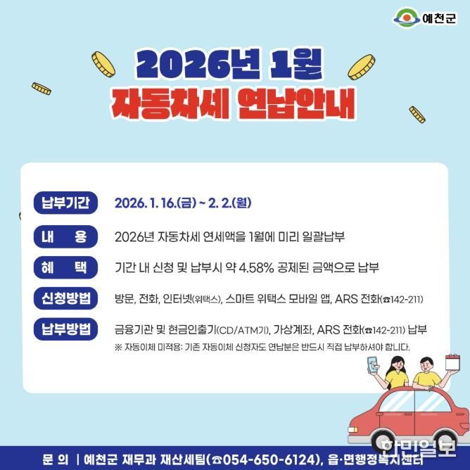 한민일보 서울포커스 임경복 기자 | 예천군은 ‘자동차세 연납 제도’를 2월 2일까지 운영한다고 12일 밝혔다.