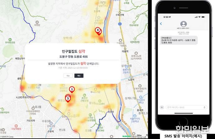 행사 당일에는 담당자가 현장에서 실시간 유동 인구를 확인할 수 있으며, 서울시 인파관리 기준에 따른 ‘경계’, ‘심각’ 단계를 문자(SMS) 등으로 안내받을 수 있다.