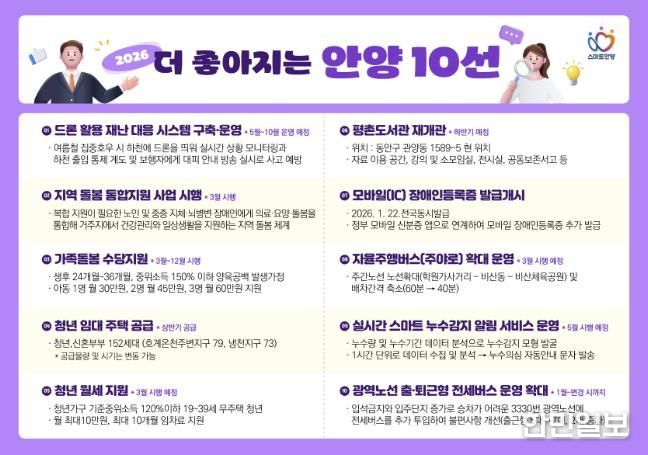 안양시(시장 최대호)는 ▲드론 활용 재난 대응시스템 구축·운영 ▲지역 돌봄 통합지원사업 시행 ▲가족돌봄수당 지원 ▲청년임대주택 공급 ▲안양시 청년월세 지원(사업대상 확대) ▲평촌도서관 재개관 등 ‘2026년 더 좋아지는 안양 10선’을 12일 소개했다.