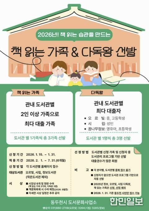 한민일보 서울포커스 임경복 기자 | 동두천시 도서문화사업소는 오는 1월 15일부터 31일까지 관내 시민을 대상으로 ‘책 읽는 가족’과 ‘다독왕’ 선발을 위한 참여자 신청을 받는다.