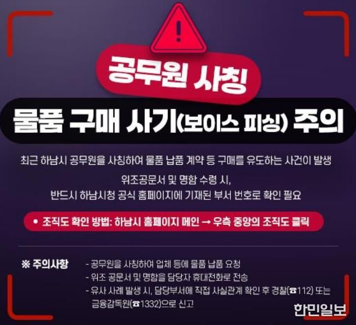 한민일보 서울포커스 유현민 기자 | 하남시는 최근 공무원을 사칭하여 관내 중소기업과 소상공인, 시민들을 대상으로 한 범죄 사례가 지속적으로 발생함에 따라 각별한 주의가 필요하다고 밝혔다.