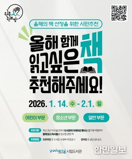 한민일보 서울포커스 임경복 기자 | 포항시는 ‘2026년 포항시 올해의 책’을 선정하기 위해 오는 14일부터 내달 1일까지 후보 도서를 추천받는다.