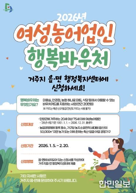군 관계자는 “여성농어업인은 농촌 현장에서 중요한 역할을 담당하고 있음에도 복지 혜택에서는 상대적으로 어려움이 있었다”며 “이번 행복바우처 사업이 여성농어업인의 생활 안정과 삶의 질 향상에 실질적인 도움이 되길 바란다”고 말했다.