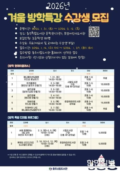 한민일보 서울포커스 김다남 기자 | 충주시립도서관은 겨울방학을 맞아 관내 초등학생을 대상으로 겨울 방학특강 수강생을 모집한다고 13일 밝혔다.