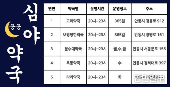 한민일보 서울포커스 김봉순 기자 | 안동시는 시민의 의약품 접근성을 높이고 심야 시간대 의료 공백을 해소하기 위해 1월 1일부터 공공심야약국을 기존 2개소에서 5개소로 확대 지정해 운영 중이다.