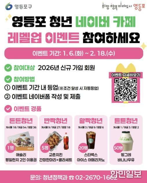 한민일보 서울포커스 임경복 기자 | 영등포구가 지역 청년들의 온라인 소통과 커뮤니티 참여를 확대하기 위해 ‘영등포 청년 네이버 카페 회원 레벨업 이벤트’를 진행한다고 밝혔다.