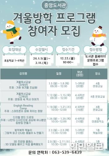 시 관계자는 “긴 겨울방학 동안 아이들이 책과 더욱 친숙해지고 다양한 체험을 통해 몸과 지성이 함께 성장하는 시간이 되길 바란다”며 “앞으로도 시민들의 독서 문화 확산을 위해 수준 높은 프로그램을 지속적으로 발굴해 운영하겠다”고 말했다.