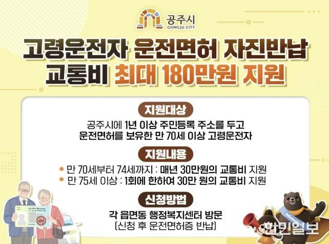 한민일보 서울포커스 임경복 기자 | 공주시는 고령운전자의 운전면허 자진반납을 유도하기 위해 올해부터 교통비 지원금을 최대 180만 원까지 상향했다고 밝혔다.