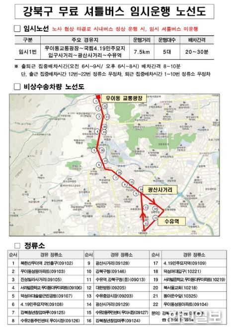 비상수송대책의 핵심으로, 구는 ‘임시 무료 셔틀버스(임시 1번)’를 운영하고 있다. 셔틀버스는 우이동 교통광장에서 수유역까지 약 7.5km 구간을 운행하며, 전세버스 10대가 투입돼 오전 6시부터 밤 10시까지 운행된다.